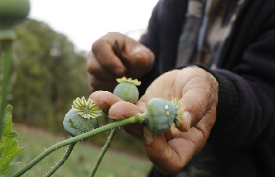 Las flores de amapola tiñen de rojo y púrpura los cerros, y su látex es recolectado a mano para venderse a intermediarios llamados “coyotes”, quienes lo acopian y lo entregan a organizaciones criminales que fabrican heroína.