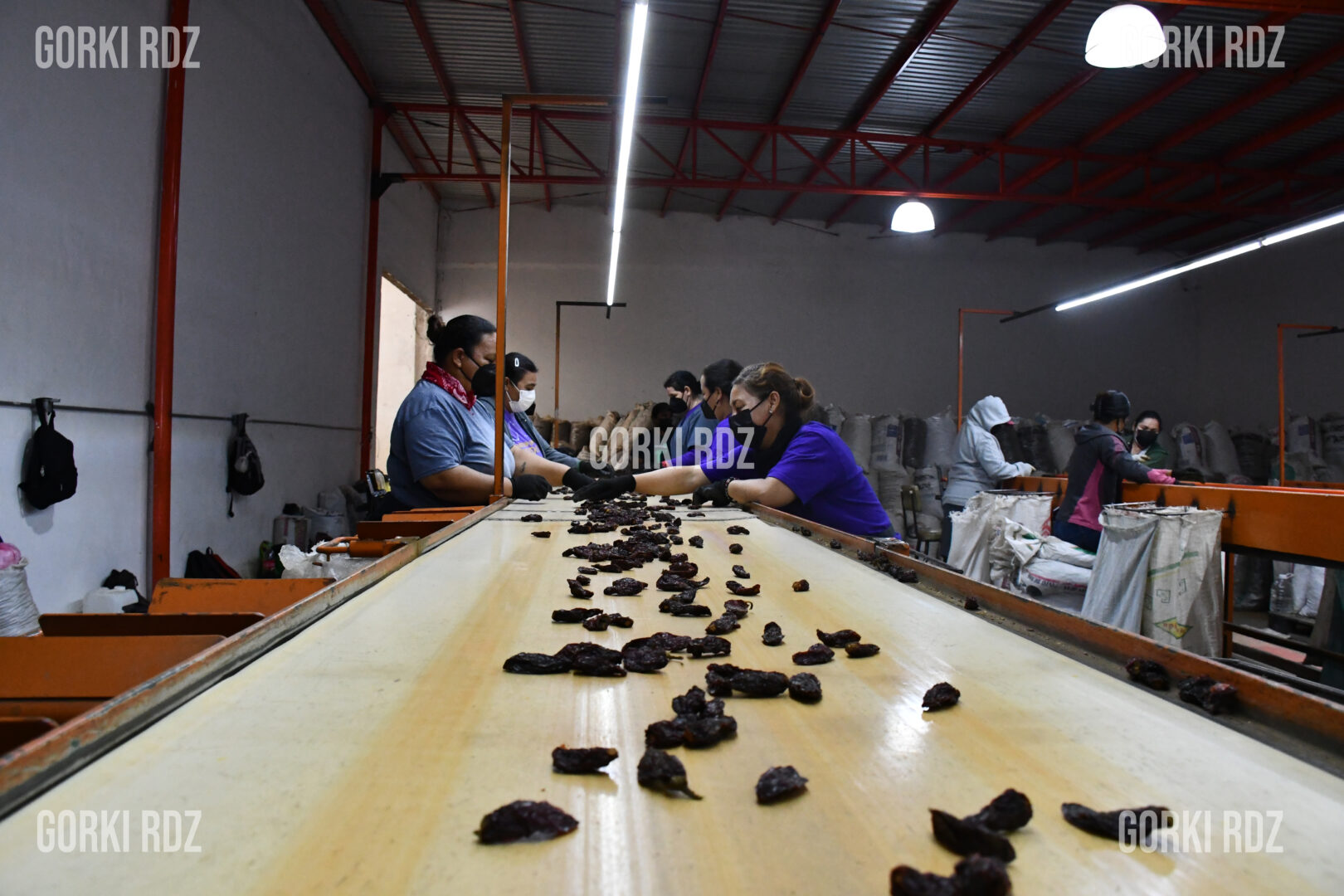 En las bandas transportadoras se escucha el golpeteo seco del chipotle, y el aire se llena del color rojizo del fruto ahumado, listo para empacarse en costales de raspa.