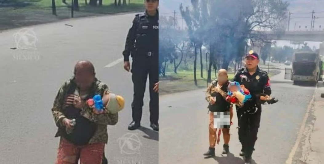 Imágenes captadas por testigos mostraron a Alicia con el cabello y la ropa chamuscada, los brazos y las piernas lastimadas, aferrada a la pequeña. En una de las escenas más impactantes, aparece hincada sobre el pavimento, exhausta, protegiendo aún a la niña.