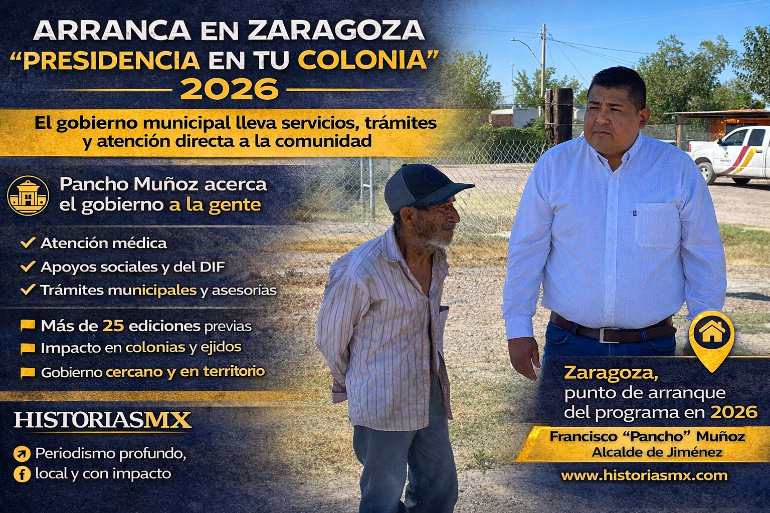 HISTORIASMX. El Gobierno Municipal de Jiménez, encabezado por el alcalde Francisco “Pancho” Muñoz, dio inicio este 2026 a una nueva jornada del programa Presidencia en tu Colonia, que este día arranca en la comunidad de Zaragoza, a partir de las 9:00 de la mañana, con la participación de todas las dependencias municipales y el DIF.