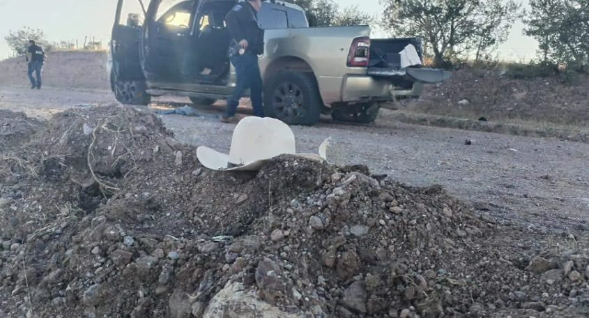 - Suburban gris con placas de Chihuahua y daños por fuego de armas largas.