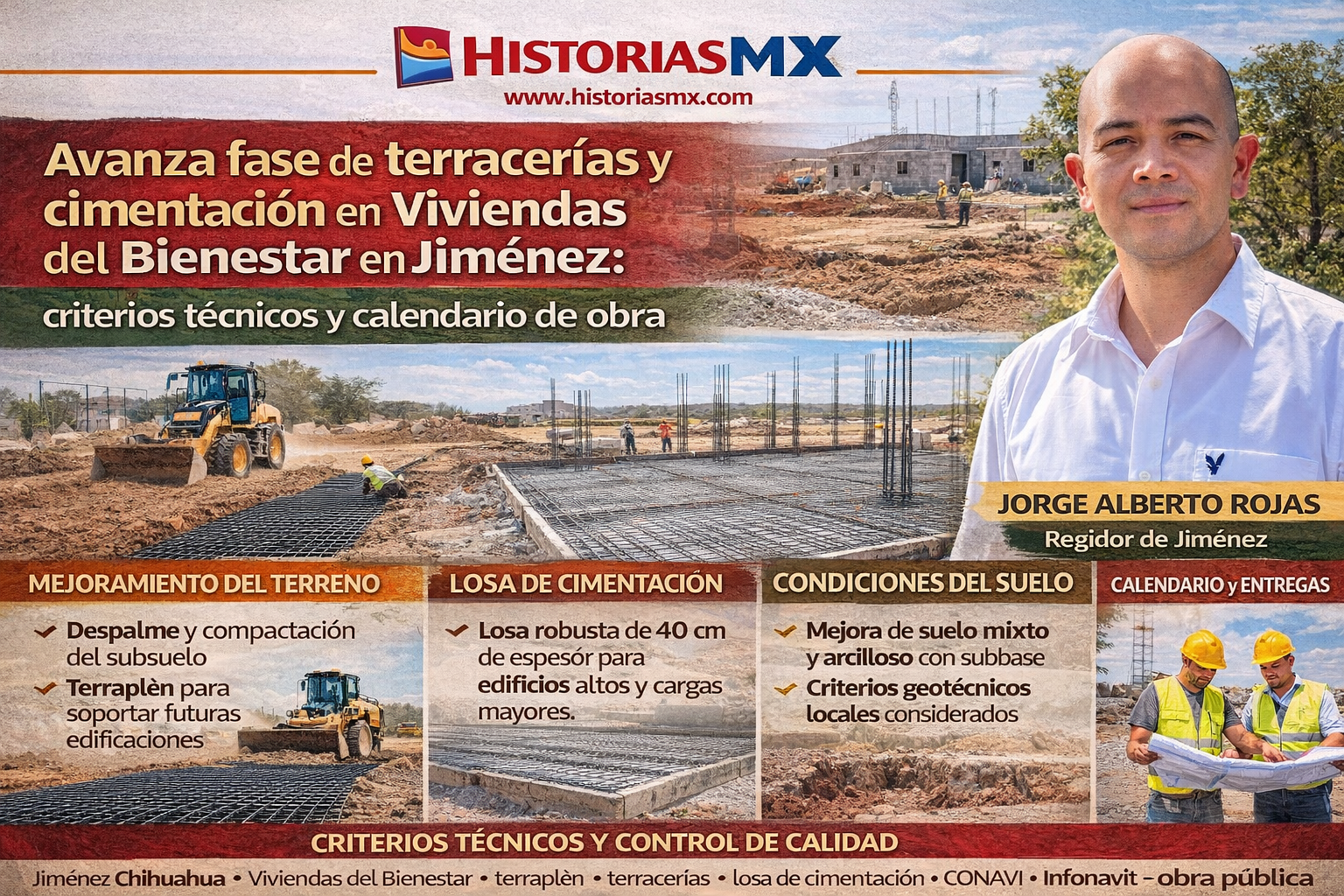 HISTORIASMX. El Ayuntamiento de Jiménez mantiene en ejecución los trabajos iniciales del proyecto de viviendas del Bienestar, actualmente en la fase de terracerías y conformación del terraplén, proceso indispensable para garantizar la estabilidad estructural de los edificios. Así lo explicó el regidor Jorge Alberto Rojas, quien detalló los criterios técnicos, el tipo de cimentación y el calendario estimado de la obra.