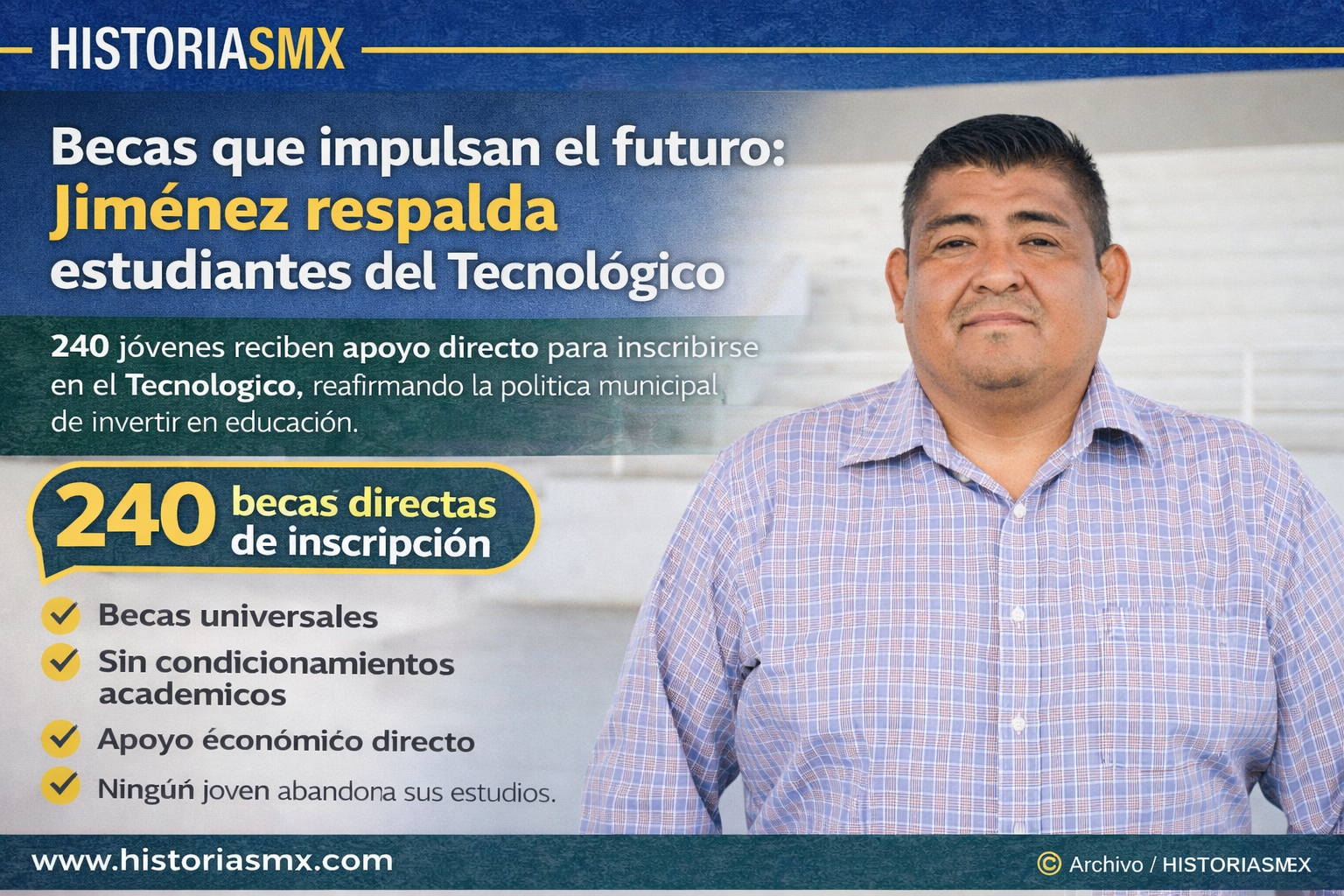 HISTORIASMX. – En un acto que reafirma la prioridad de la educación en la agenda municipal, el alcalde de Jiménez, Pancho Muñoz, encabezó la entrega de 240 becas de inscripción a estudiantes del Instituto Tecnológico de Jiménez, apoyos otorgados de manera directa y en efectivo, con el objetivo de que ningún joven abandone sus estudios por falta de recursos.