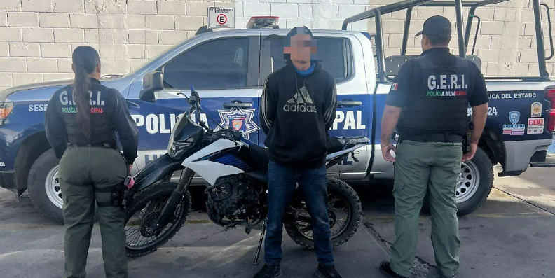 HISTORIASMX. Elementos de la Dirección de Seguridad Pública Municipal detuvieron este miércoles a un joven que conducía una motocicleta con reporte de robo, luego de protagonizar una persecución por la avenida Centauro. El aseguramiento ocurrió alrededor de las 14:50 horas, cuando los oficiales lograron cerrarle el paso en el sector de Rinconadas del Sol.
