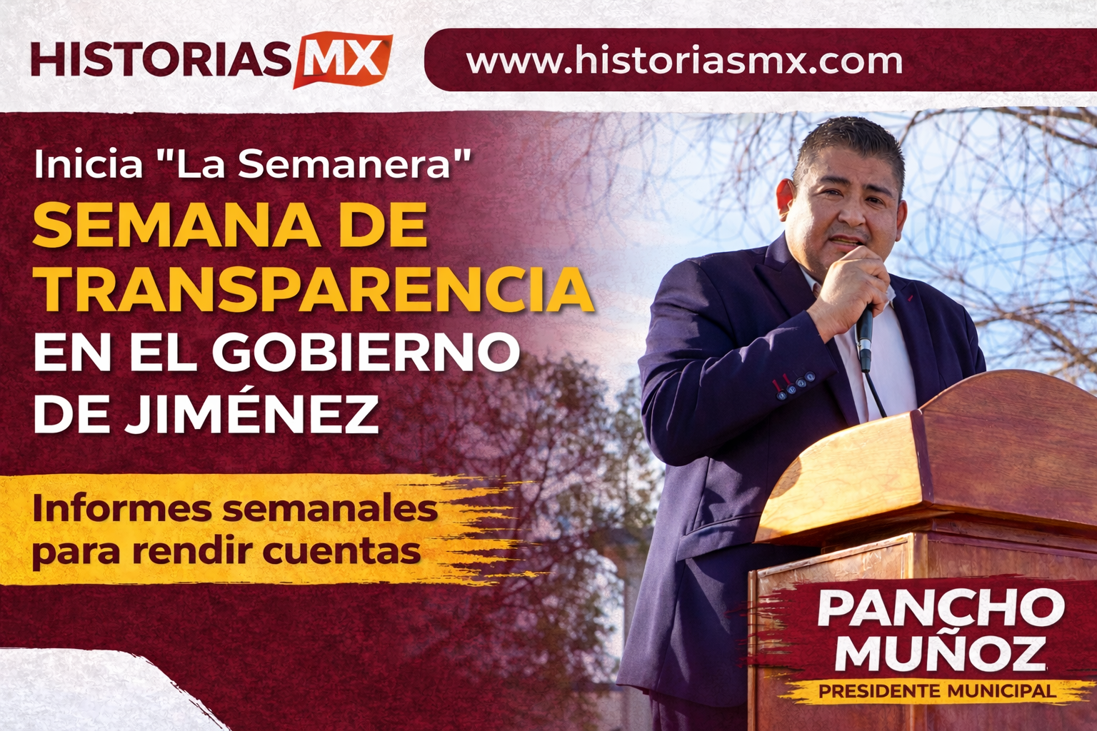 HISTORIASMX. — El Gobierno Municipal de Jiménez anunció el inicio de un nuevo ejercicio de transparencia y acceso a la información pública denominado “La Semanera”, un informe que será presentado cada semana por el alcalde Francisco “Pancho” Muñoz para dar a conocer las acciones, avances y resultados de cada departamento de la administración 2024–2027.