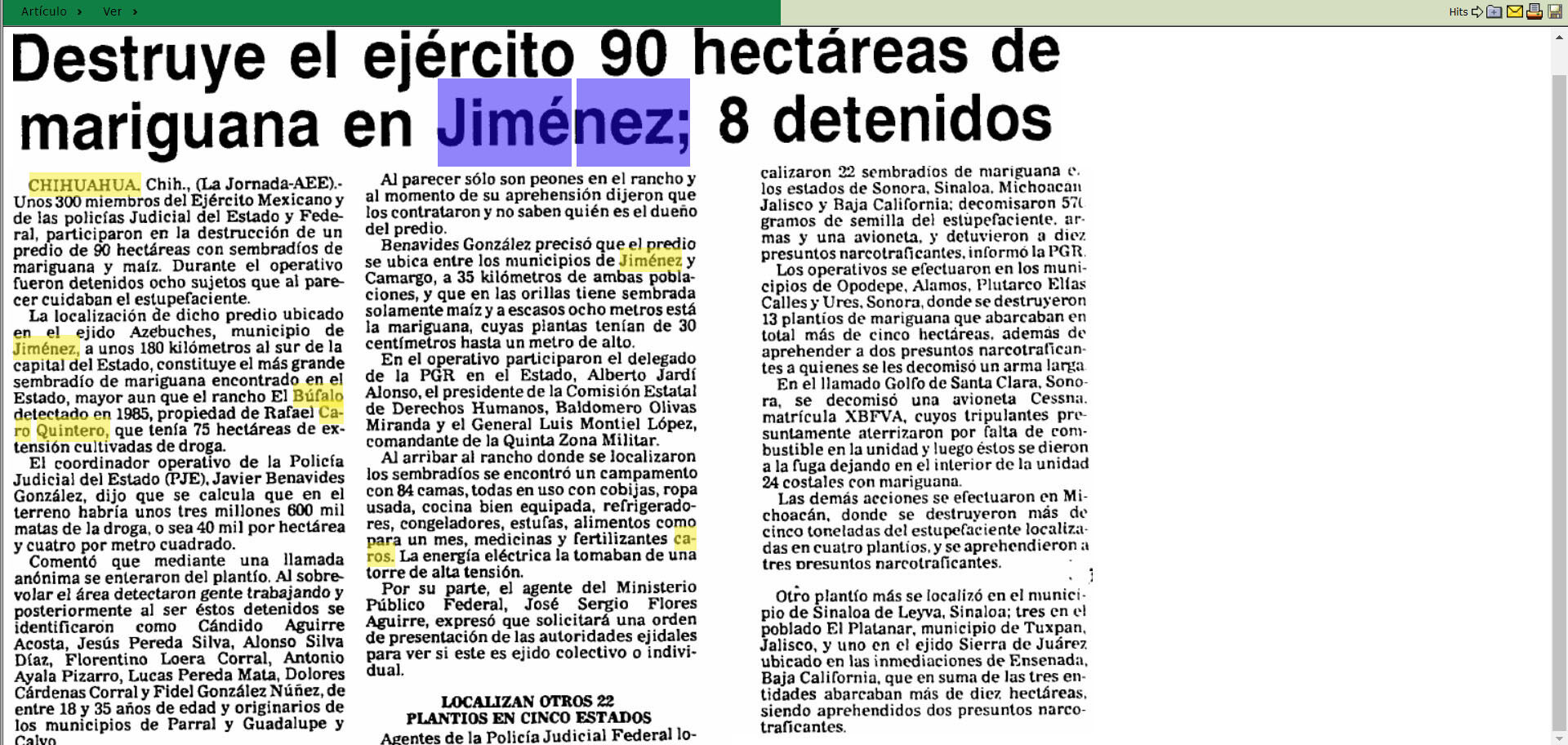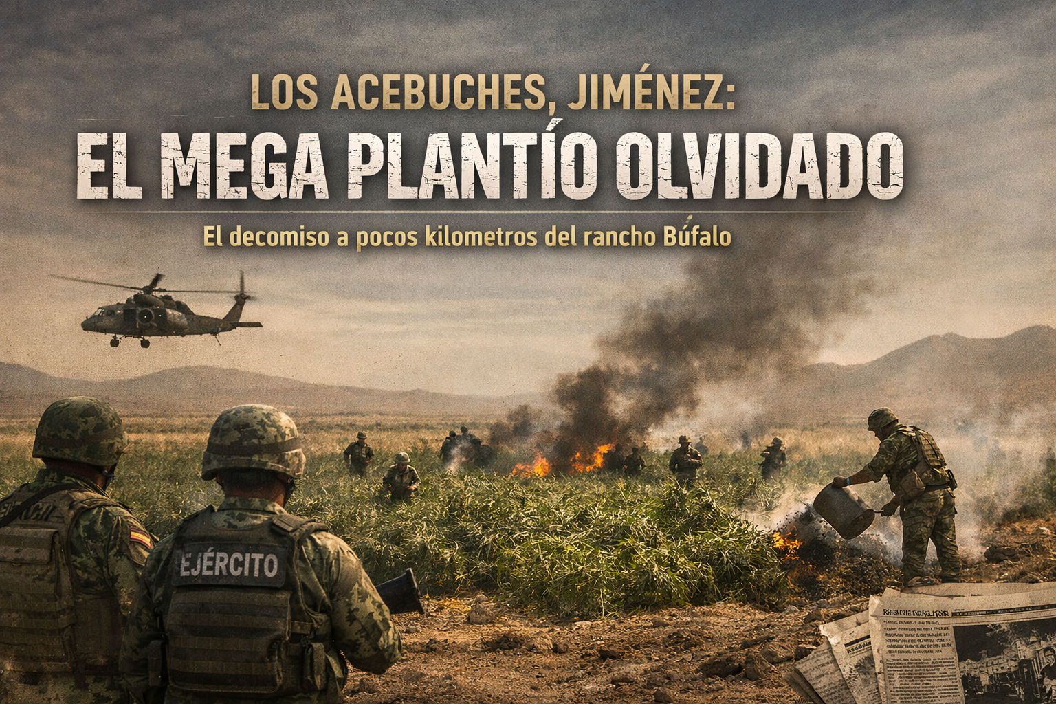 Jiménez, Chihuahua. — Entre los archivos de la hemeroteca del Periódico El Siglo de Torreón se conserva el registro de uno de los decomisos de droga más relevantes y menos difundidos del norte del país. El 4 de agosto de 1994, en el ejido Los Acebuches, municipio de Jiménez, el Ejército Mexicano destruyó un mega plantío de marihuana localizado a pocos kilómetros del histórico rancho Búfalo, escenario de otro decomiso emblemático ocurrido una década antes.