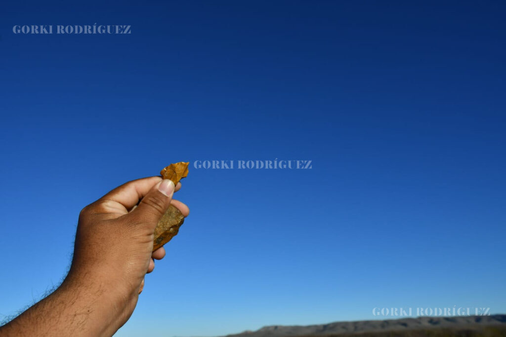 A unos metros de los morteros se hallaron escamas líticas, subproductos característicos de la elaboración de puntas de flecha. Estas escamas indican que el sitio no solo fue un espacio de molienda, sino también un taller de manufactura.