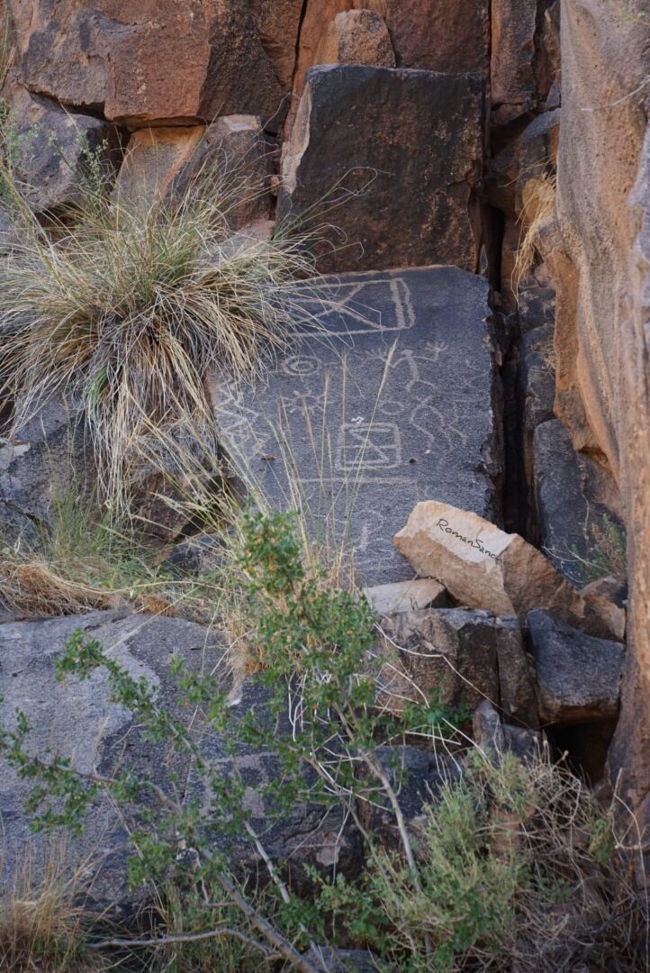 Vandalismo, incluyendo grafitis modernos que han dañado algunas rocas.