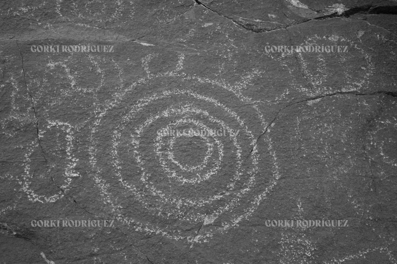 Otro petrograbado de importancia, cuya ubicación no se detalla para protegerlo, representa una cadena de cerros detrás de la cual se oculta el sol, identificado mediante círculos concéntricos. La escena contrasta visualmente con el atardecer real del sitio, lo que refuerza la interpretación astronómica del conjunto.