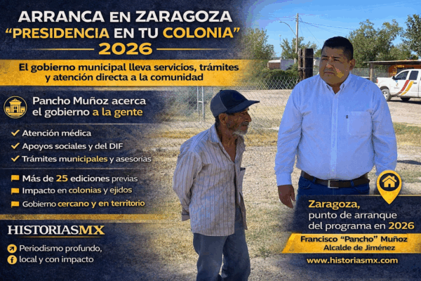 El gobierno municipal lleva trámites, servicios y atención directa a la comunidad desde las 9:00 de la mañana HISTORIASMX. El Gobierno Municipal de Jiménez, encabezado por el alcalde Francisco “Pancho” Muñoz, dio inicio este 2026 a una nueva jornada del programa Presidencia en tu Colonia, que este día arranca en la comunidad de Zaragoza, a…