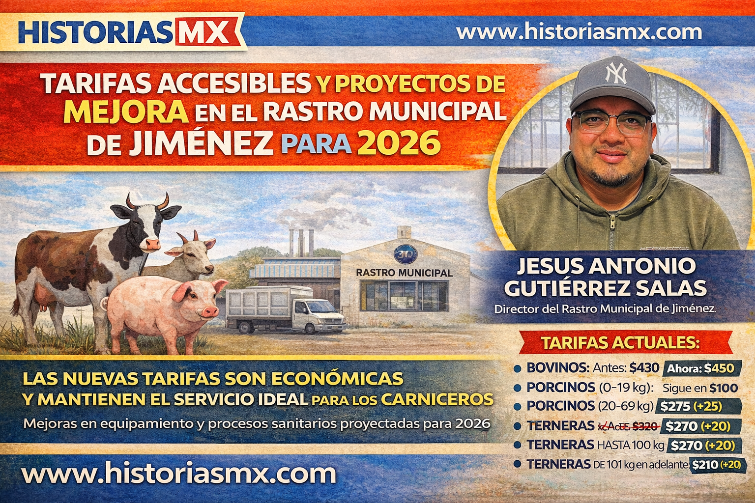 HISTORIASMX. – El Rastro Municipal de Jiménez inició 2026 con una actualización moderada en las tarifas de sacrificio, luego de que durante todo el año anterior no se aplicara ningún incremento. Así lo dio a conocer su director, Jesús Antonio Gutiérrez Salas, quien explicó que los ajustes responden a la entrada en vigor de la Ley de Ingresos Municipal y a la necesidad de mantener la operatividad, sanidad y eficiencia del servicio sin afectar de forma significativa a los carniceros y usuarios frecuentes.