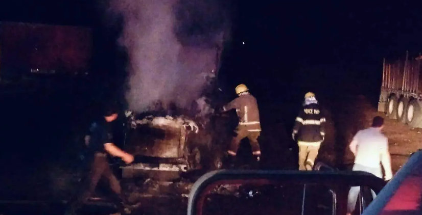 Un cortocircuito habría provocado el incendio que consumió totalmente un tractocamión en la carretera a Santa Bárbara durante la madrugada de este viernes; no se reportaron personas lesionadas.