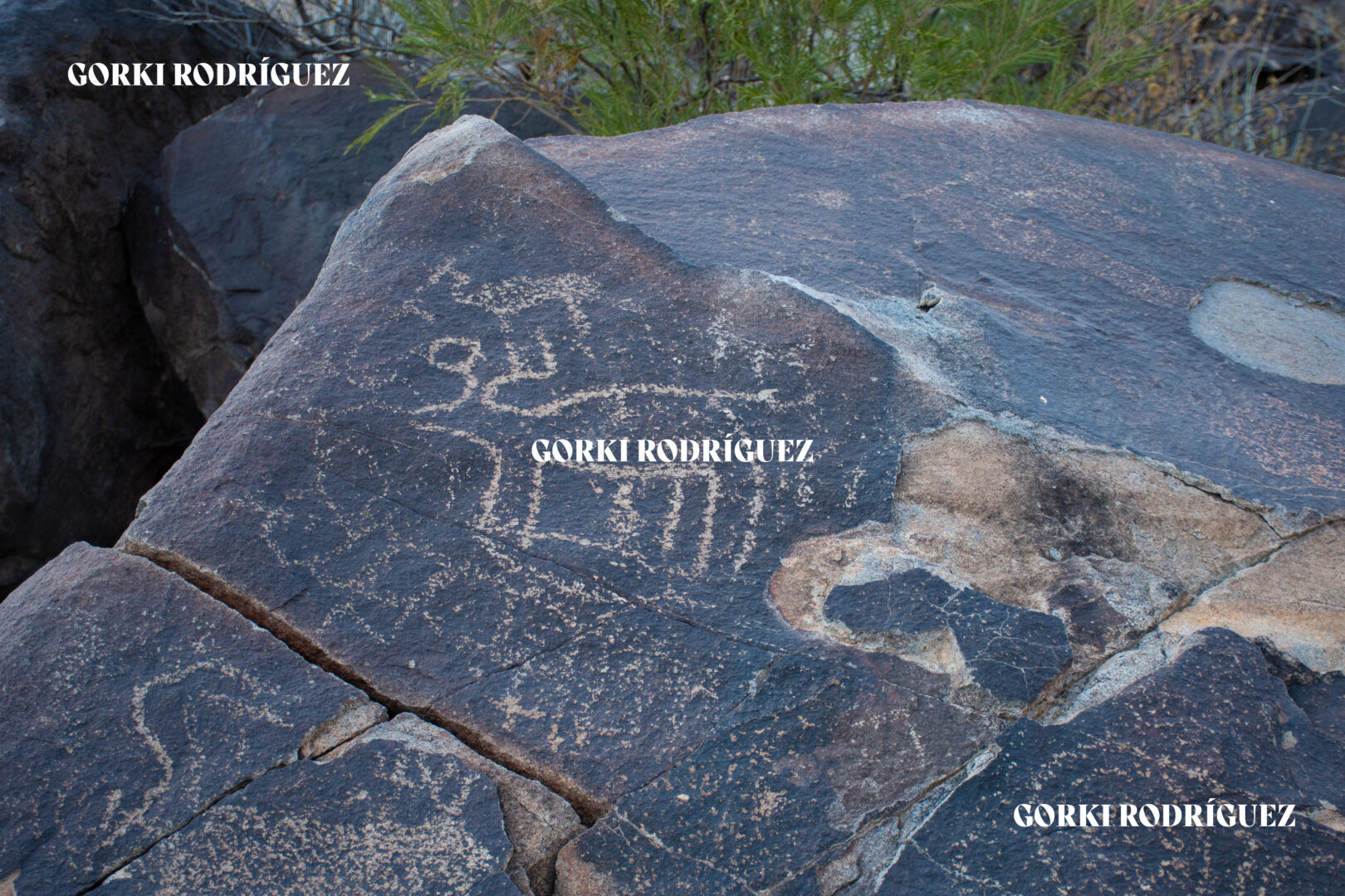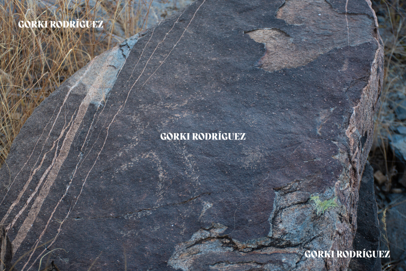 En las mismas tierras donde se localizaron restos de cuentas, pigmentos y herramientas líticas, emerge un conjunto excepcional de petrograbados arcaicos tallados sobre roca volcánica. Estas manifestaciones, cuya antigüedad es difícil de precisar pero que se vinculan a periodos muy arcaicos previos a cualquier desarrollo agrícola regional, constituyen uno de los hallazgos rupestres más significativos del sur de Chihuahua.